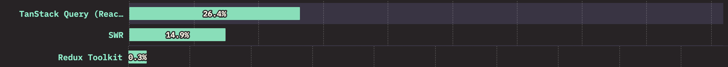 RTK Query의 경우 RTK에 포함되어 있어 정확한 통계 수치를 얻긴 힘들지만 npm trends의 최근 1년 다운로드 수와 State of JS 2022에서의 각 라이브러리 비교는 다음과 같습니다.