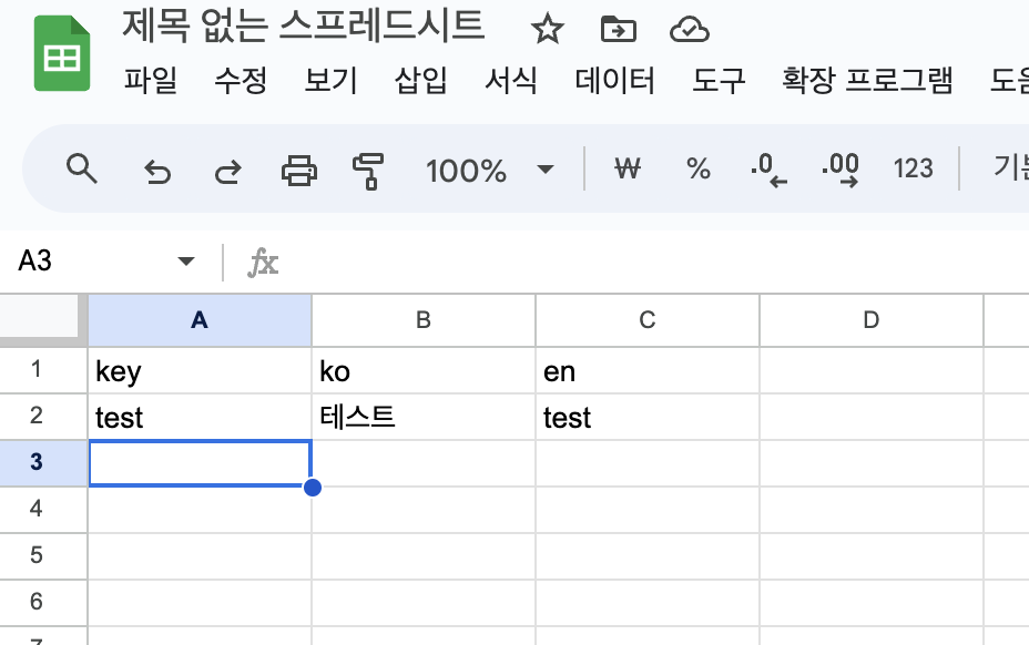 작업을 진행하기 앞서 Google Spreadsheet를 작성합니다. 작성된 다국어를 key-value 형태의 JSON으로 만들기 위해 key row와 사용할 다국어 언어 row를 만들어 작성합니다.